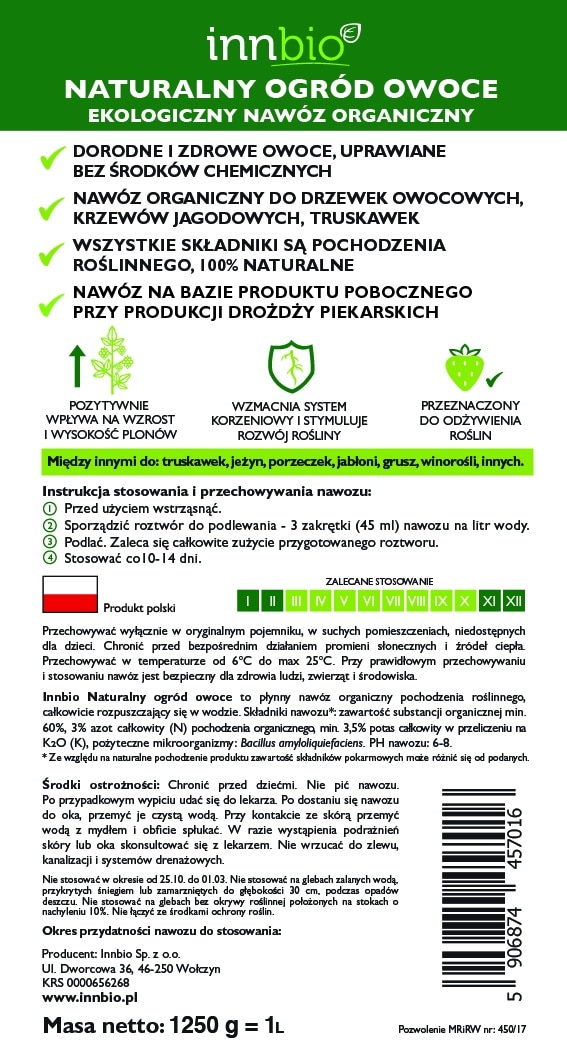Innbio Naturalny ogród owoce, to płynny nawóz organiczny pochodzenia roślinnego, całkowicie rozpuszczający się w wodzie, ekologiczny i bezpieczny.